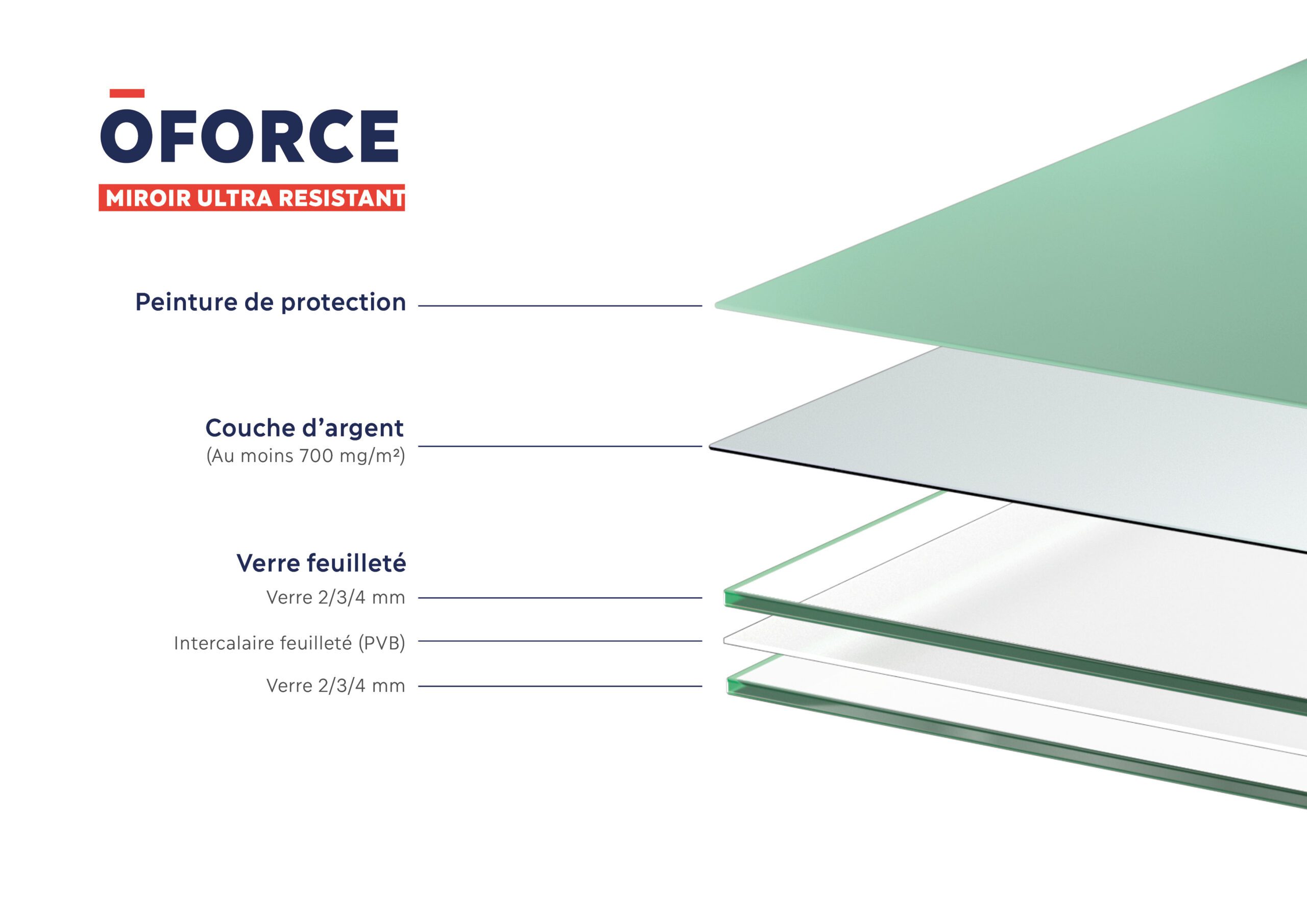 Grâce aux propriétés du verre feuilleté, OFORCE dispose d’une rigidité et d’une résistance accrue. La réflexion lumineuse de OFORCE est similaire à un miroir monolithique standard de même épaisseur.